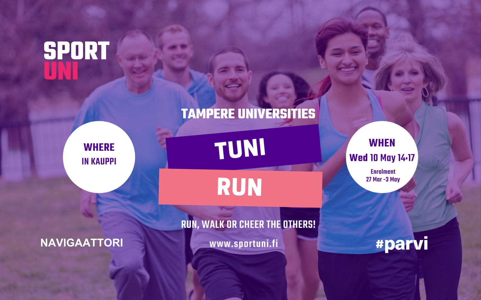 TUNI RUN is a free event for students and staff of all Tampere Universities. The event includes a guided warm-up before the start, and after the finish line, there will be crepes with jam. Navigaattori and Parvi also takes part to the event.