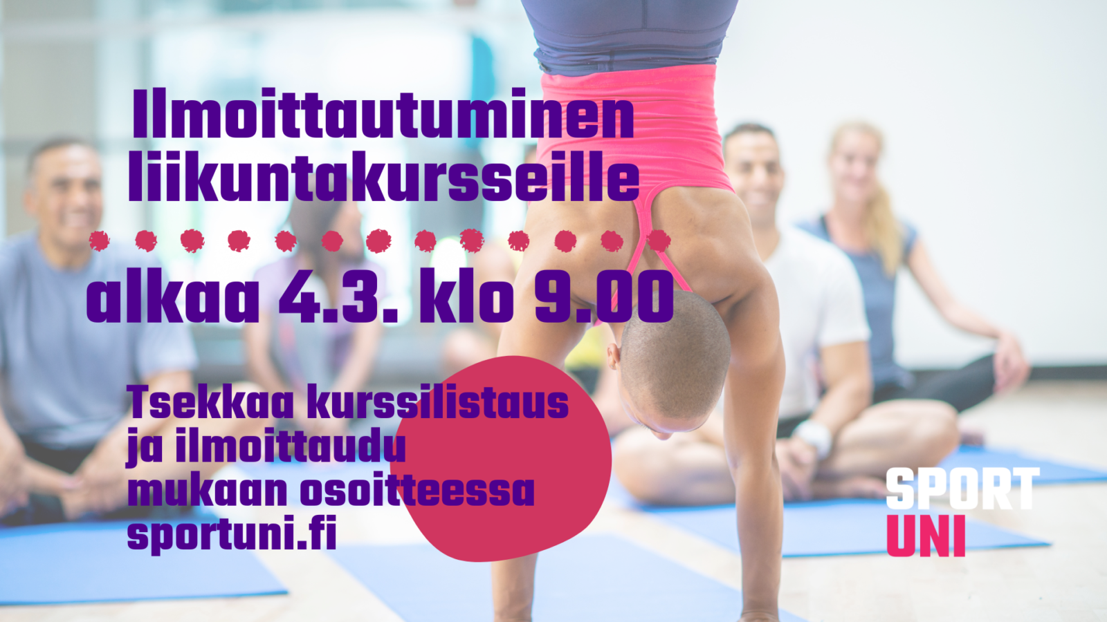 SportUnin kevään 2024 toinen kurssi-ilmoittautumisjakso alkaa maanantaina 4.3. klo 9.00 ja päättyy keskiviikkona 13.3. klo 23.59. Tarjolla on kursseja laidasta laitaan: hiihtoa, tanssia, uintia, seinäkiipeilyä, käsilläseisontaa ja paljon muuta!