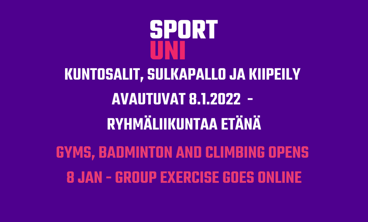 SportUnin liikuntakeskuksissa voi 8.1.2022 alkaen käydä kuntosaleilla, pelata sulkapalloa ja kiipeillä. Kaikkiin toimintoihin varataan vuoro SportUnin tarjontakalenterin kautta. Vuorovarauksella pystymme takamaan turvallisen harjoitteluympäristön, jossa turvavälit on mahdollista säilyttää. Uudet vuorot tulevat varattavaksi seuraavalle viikolle jokaisen viikon torstaina klo 8.45. Lauantaina 8.1. ja sunnuntaina 9.1. kuntosaleille voi tulla ilman varausta, työntekijämme valvovat tilojen henkilömääriä. Viikon 2 kuntosalivuorot tulevat poikkeuksellisesti varattaviksi maanantaina 10.1.