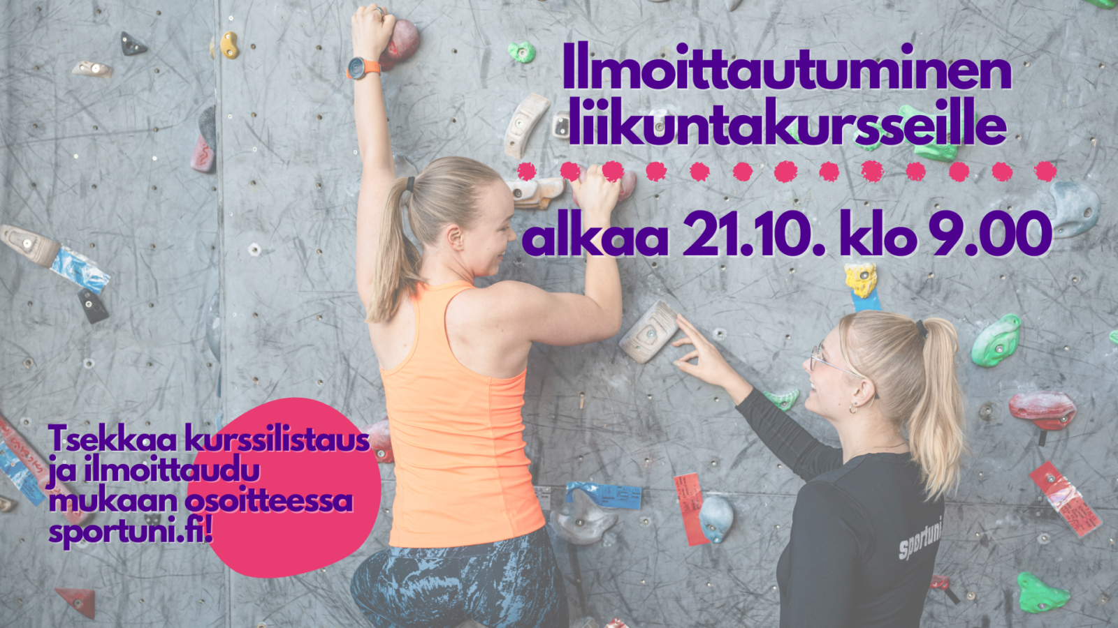 SportUnin syksyn 2024 toinen kurssi-ilmoittautumisjakso alkaa maanantaina 21.10. klo 9.00 ja päättyy keskiviikkona 30.10. klo 23.59. Tarjolla on kursseja laidasta laitaan: tanssia, sirkusta, laitepilatesta, kamppailulajeja ja paljon muuta!