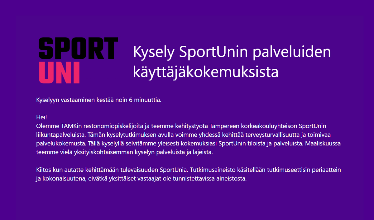 Me Tampereen ammattikorkeakoulun restonomiopiskelijoiden tiimi olemme ottaneet tehtäväksemme selvittää SportUnin palveluiden käyttäjäkokemusta ja terveysturvallisuutta seuraavan kyselyn avulla.