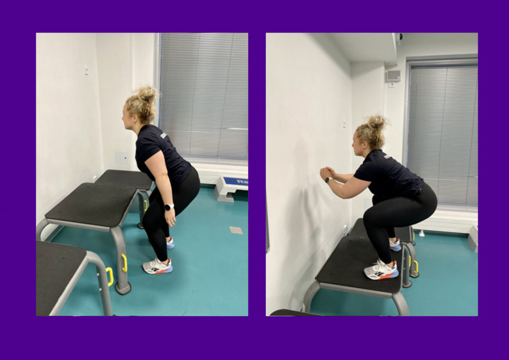 Ponnista hyvästä alkuasennosta suoraan ylös korokkeen päälle niin, että koko jalkaterä tulee korokkeen päälle ja samalla joustaen jaloista. Joko rauhallinen askel takaisin alas tai tasaponnistuksella kontrolloidusti. Huomioi, että polvivarvas linja on eteenpäin.