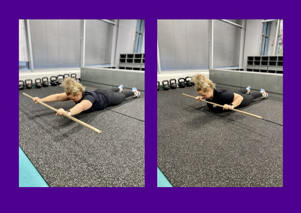 Asetu vatsalleen makaamaan. Vie keppi vartalon eteen suorille käsille. Nosta rintakehä irti lattiasta, vedä keppi rinnalle ja ojenna keppi takaisin suorille käsille. Palaa takaisin lähtöasentoon. Huomioi, että pidät niskan suorana (katse kohti lattiaa).