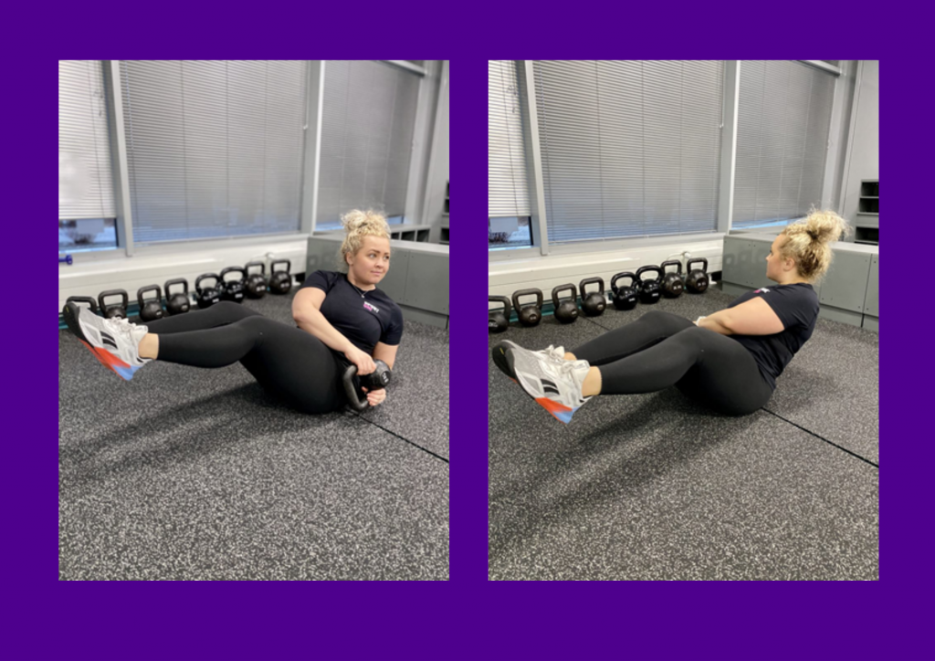 Istu niin, että nojaat taaksepäin, jalat nostettuna ilmaan. Vie painoa vartalon puolelta toiselle samalla itseään kiertäen ja katse mukana seuraten. Omaa kaltevuutta muuttaen, saa treenistä rankemman.