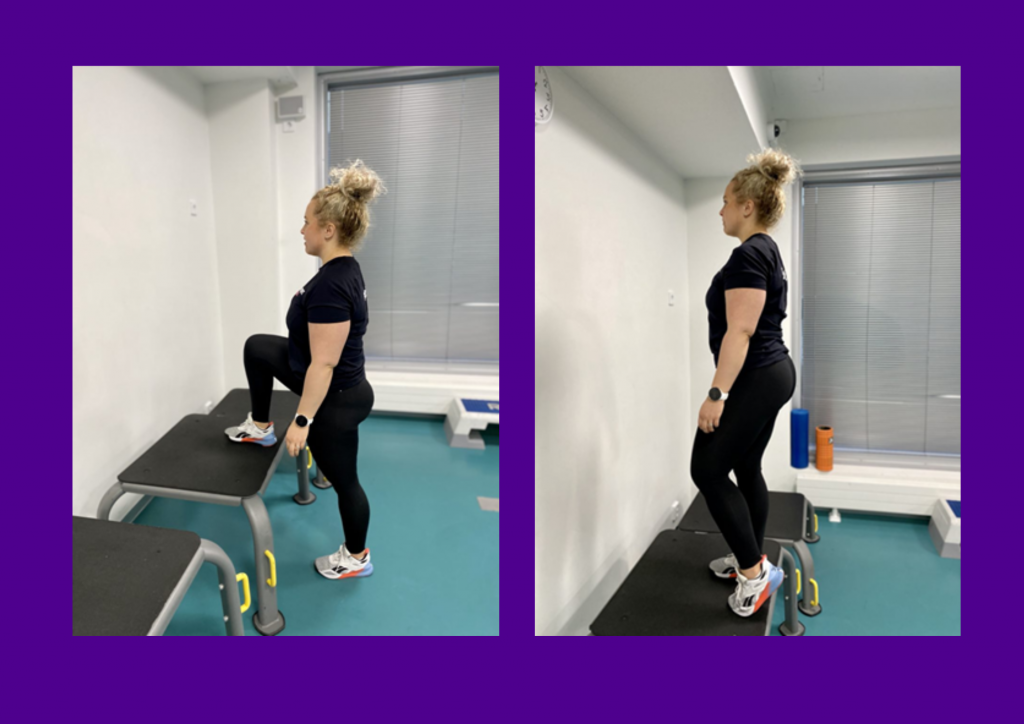 Ota askel korokkeelle koko jalkaterällä. Säilytä lantion ja lannerangan keskiasento sekä nilkan ja jalkaterän kontrolli. Palauta rauhassa takaisin alas ja nouse saman tien uudestaan ylös.