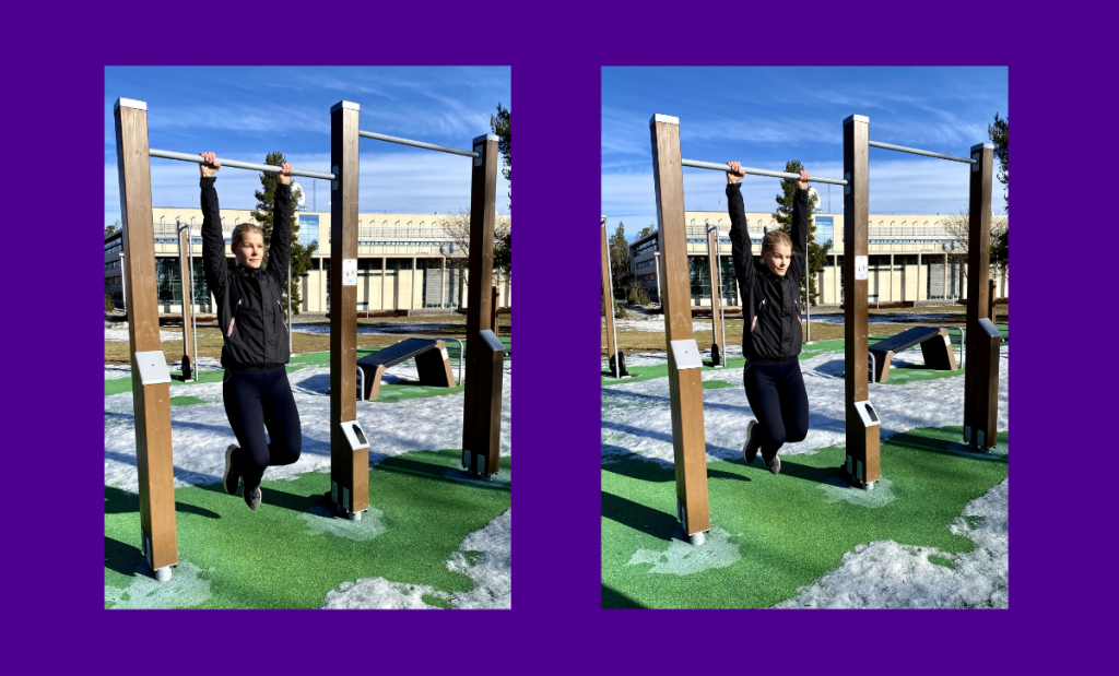 Ota tangosta hieman hartioitasi leveämpi ote. Pidä kyynärät suorina koko liikkeen ajan. Roiku passiivisesti tangossa. Vedä lapaluitasi voimakkaasti alaspäin ja kohti selkärankaa. Palaa takaisin passiiviseen roikuntaan.