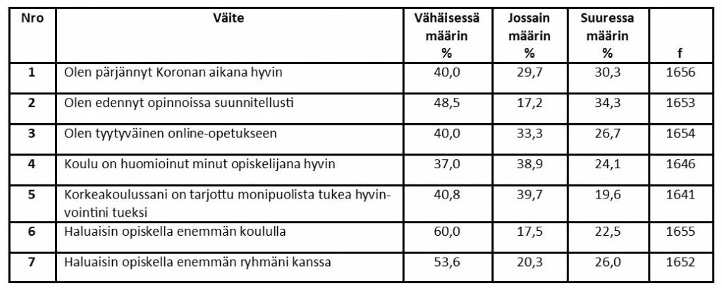 Enemmistö opiskelijoista (40 % – 60 %) valitsi vastausvaihtoehdon ’vähäisessä määrin’ kaikkiin muihin väitteisiin, paitsi väitteeseen 4: ”Koulu on huomioinut minut opiskelijana hyvin”. Tällöinkin vastausvaihtoehtojen ’jossain määrin’ (40 % vastaajista) ja ’vähäisessä määrin’ valinneiden (37 %) määrän välillä oli vain muutaman prosentin ero. Väitteeseen ”korkeakoulussani on tarjottu monipuolista tukea hyvinvointini tueksi” oli vastannut ’jossain määrin’ lähes yhtä moni (40 % vastaajista) kuin ’vähäisessä määrin’ (41 % vastaajista). Sekä väite halusta opiskella enemmän koululla että väite ryhmän kanssa opiskelusta saivat kuitenkin yli puolet opiskelijoista vastaamaan ’vähäisessä määrin’ (60 % ja 54 %) (taulukko 1).