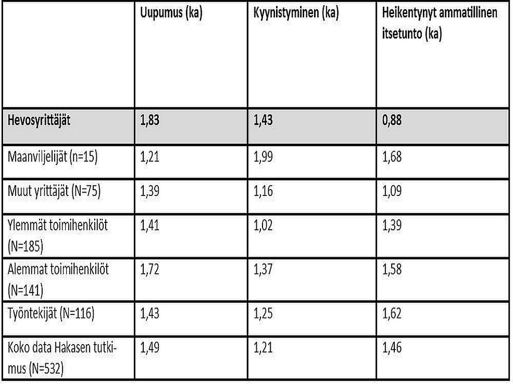 Lähes kaikki hankkeeseen osallistuvat antoivat luvan käyttää tietojaan tutkimustarkoituksissa. Vastaajat olivat kaikki naisia (n=13), ikähaitarin ollessa 24- 57 vuotta. Uupumuksen keskiarvo oli 1,83, kyynistymisen 1,43 ja heikentyneen ammatillisen itsetunnon 0,88. Kuva 2 esittelee keskiarvoja Hakasen (2004) tutkimuksesta, jossa verrataan eri ammattialoja keskenään. Hevosyrittäjien uupumus on huomattavasti korkeammalla tasolla kuin muiden, ja myös kyynistymisen aste on toiseksi korkein. Vain maanviljelijät saivat korkeampia arvoja kyynistymisessä. Hevoset poikkeavat muiden eläinten hoidosta erittäin yksilökohtaisen hoidon takia, jolloin yksittäinen hevonen työllistää paljon enemmän kuin esimerkiksi nauta tai sika. Hevoset puetaan usein talvella ulos loimiin, talutetaan yksitellen ulos ja jokaisella on oma yksilöity ruokintaohjelmansa. Verrattuna esim. älynavettoihin on hoidon tarve per hevonen huomattavasti suurempi kuin naudalla.