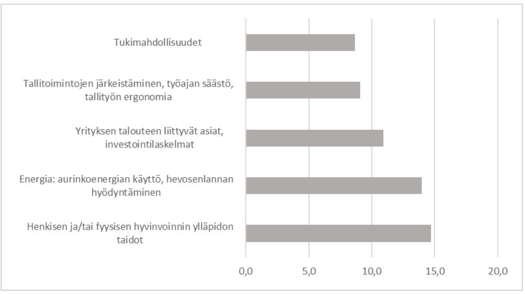 Hankehakemuksen laadintavaiheessa kartoitimme pirkanmaalaisten hevosalan yrittäjien koulutus- ja tukitarpeita. Kartoitukseen vastasi 32 alan yrittäjää ja kyselyn perusteella muodostui käsitys siitä, millaista tukea ja koulutusta yrittäjät Pirkanmaalla tarvitsisivat ja haluaisivat. Talliyrittäjät kokivat tärkeimmiksi koulutuksen ja osaamisen tarpeikseen henkistä hyvinvointia koskevat aiheet, yrityksen talouteen sekä tukimuotoihin liittyvät asiat sekä erilaiset energiaratkaisut. EU-direktiivien aiheuttamat uudet vaatimukset koskien tallien toimintaa koettiin kiinnostaviksi, kuten myös sosiaalisen median käyttö markkinoinnissa ja sopimustietous. Kiinnostusta herättivät myös vaikeiden asiakkaiden kohtaaminen, ensiaputaidot sekä mm. tarhojen, pihojen ja salaojitusten sijaintien rationalisointi (ks. kuva 1). Hyvinvoinnin korostuminen ei tullut yllätyksenä, koska yrittäjien työhyvinvointi on usein asia, josta ensimmäisenä tingitään kiireaikoina. Arjen yllättävät tapahtumat ja ”tulipalojen sammuttamiset” ajavat usein yrittäjän oman hyvinvoinnin ohi, ja pidemmällä aikajänteellä hyvinvointi saattaa kärsiä paljonkin.