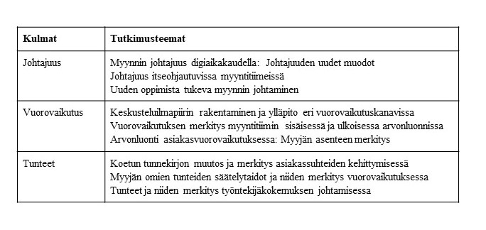 Tutkimusryhmämme viitekehyksen (kuva 1) näkökulmasta olemme löytäneet sellaisia tärkeitä tulevaisuuden tutkimusteemoja ja tutkimuskysymyksiä, jotka yhdistävät tutkimuksellisia mielenkiintojamme ja osaamistamme poikkitieteellisesti. Tavoitteenamme on löytää vastauksia mm. kuvassa 2 esiin tuotuihin tutkimusteemoihin johtamisen, vuorovaikutuksen ja tunteiden ”kulmista”. Tutkimusteemojen poikkileikkaavana kontekstina on arvonluonti digiaikakaudella ja siihen liittyvät myynnin osaamisvaateet.