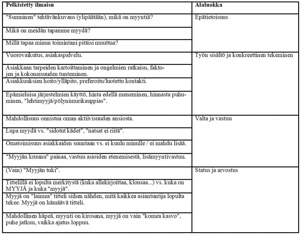Myynnillisyys näyttäytyi ja rakentui aineistossa yleisempänä epätietoisuutena, työn konkreettisina sisältöinä, valta- ja vastuukysymyksinä sekä myyntityön statuksena ja arvostuksena. Kuvassa 1 listataan myynnillisyyden jäsentymisen alaluokat siten, että kunkin kohdalla alla esitetään niitä kuvaavia pelkistettyjä ilmaisuja.