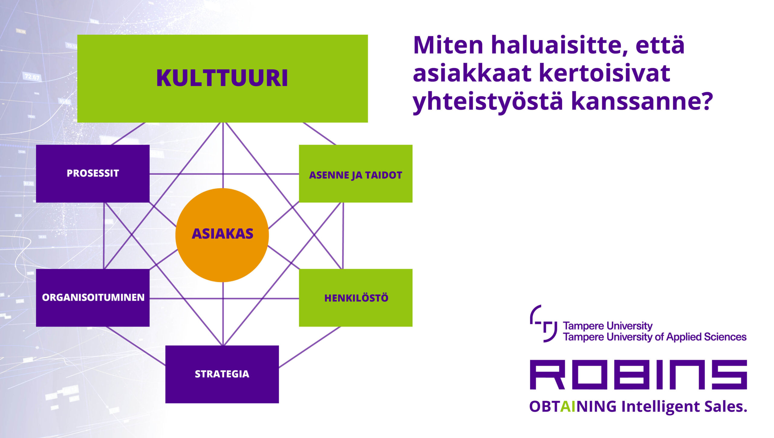 Yhdeksi keskeiseksi menestystekijäksi nousi kulttuuri. Myyntikulttuuri välittyy suoraan asiakkaille esimerkiksi myyjän asenteen ja toimintatyylin sekä niiden perustelujen kautta, joilla myyjä pyrkii vaikuttamaan asiakkaan päätöksentekoon. Mitä myyntikulttuuri oikein on ja miten siitä saisi otteen, jotta sitä voitaisiin myös päämäärätietoisesti johtaa? Millaisin sanakääntein ja tunnelmin haluaisit, että sinun yrityksesi asiakkaat kertoisivat eteenpäin yhteistyöstä kanssanne?