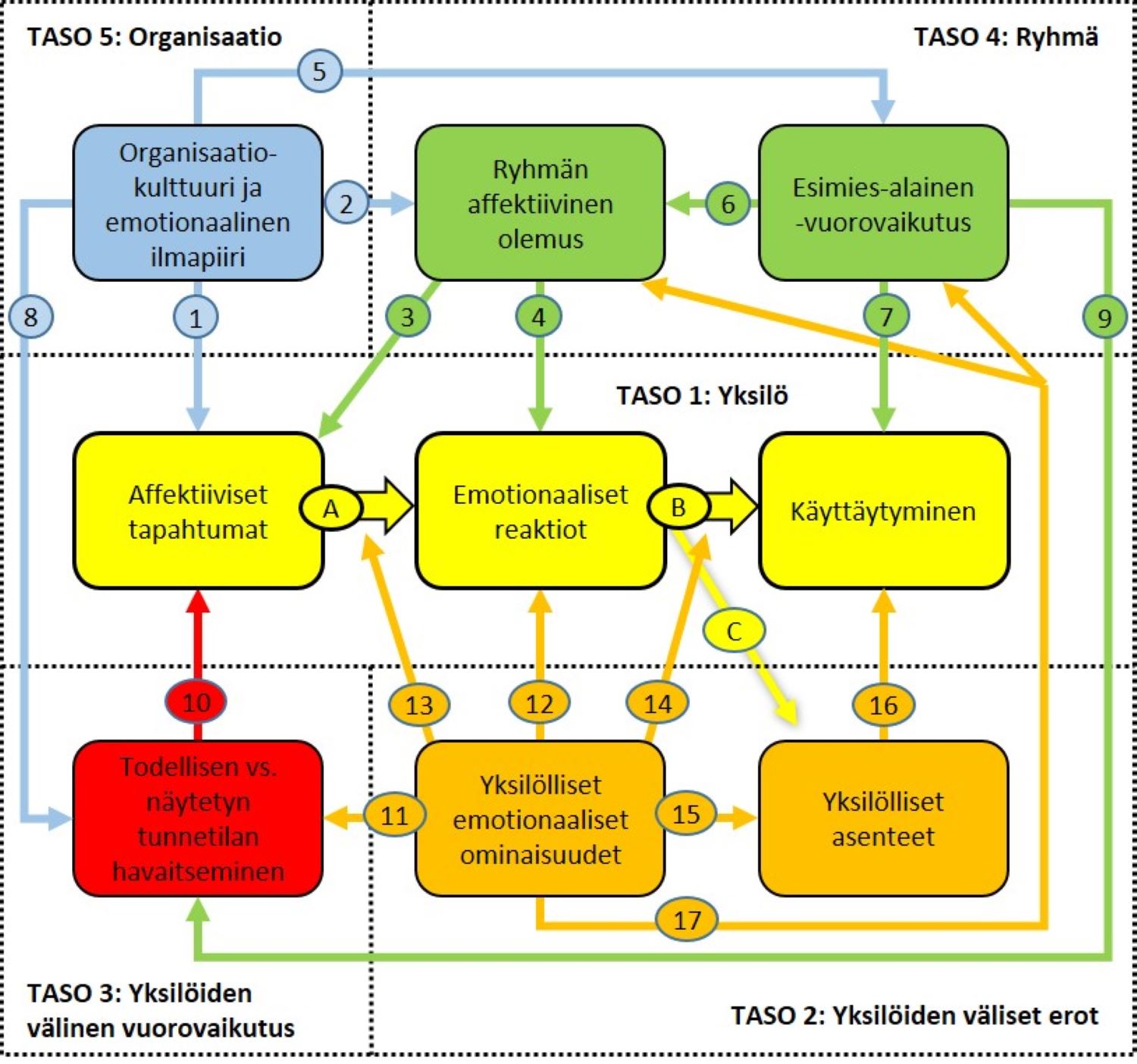 Ashkanasyn (2003) kehittämässä mallissa tunnetilat vaikuttavat organisaatioissa viidellä toisiinsa kytkeytyvällä tasolla (kuva 1). Mallissa organisaatiokulttuuri ja emotionaalinen ilmapiiri ovat organisaatiotason tekijöitä, joka vaikuttavat suoraan tai välillisesti kaikilla muilla tasoilla. Eri tasoilla tapahtuvat asiat vaikuttavat organisaation affektiivisiin tapahtumiin. Näihin tapahtumiin reagoidaan emotionaalisesti (A), mikä puolestaan vaikuttaa (B) yksilön käyttäytymiseen, esimerkiksi suoriutumiseen työssä sekä (C) asenteisiin (kuten työtyytyväisyys).