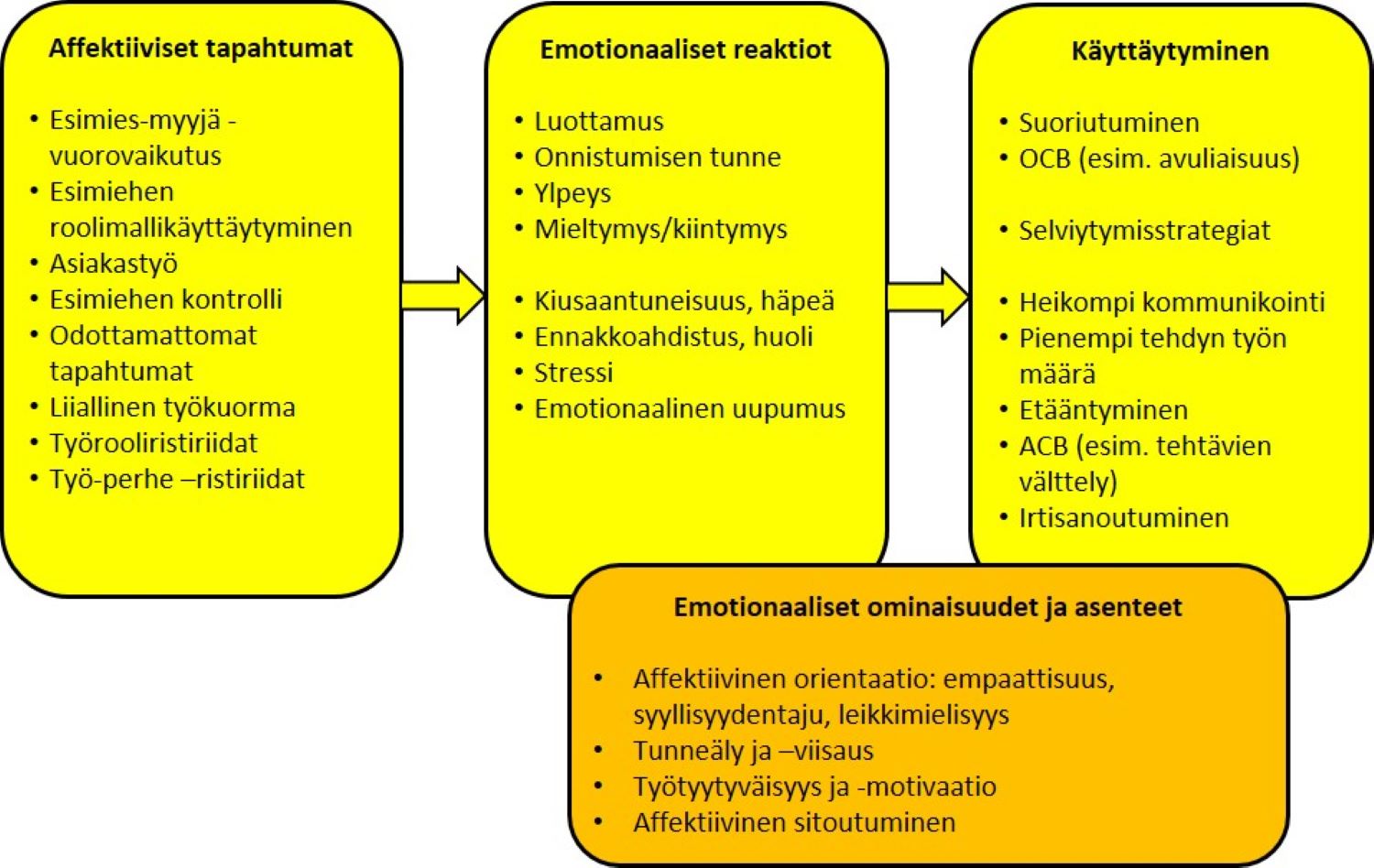 Kuvassa 2 keskitytään edellä esitellyn mallin yksilötasoihin 1 ja 2. Kuvaus perustuu Erevelles & Fukawan (2013) katsausartikkeliin tyypillisistä tunnetiloista sekä niiden roolista myyntityössä ja sen johtamisessa, mutta todellinen tunnetilojen kirjo syineen, seurauksineen ja muine yhteyksineen on tätä laajempi ilmiö ja kaipaa lisää tutkimusta (Erevelles & Fukawa 2013, 16–19). Edellä kuvattu Ashkanasyn (2003) malli käsittelee organisaation sisäisiä suhteita, mutta esimerkiksi asiakaskontaktit aiheuttavat monenlaisia tunnetiloja myyjässä ja asiakkaassa. Näin ollen kuviossa 2 on otettu mukaan myös asiakastyö, joskin asiakkaan kokemat tunnetilat on rajattu tarkastelun ulkopuolelle.