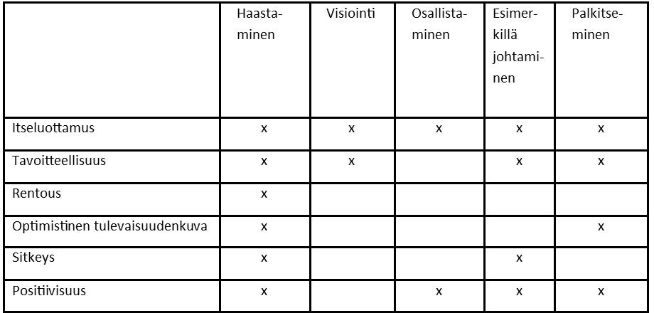 Itsevarmat, tavoitteelliset ja optimistiset esimiehet käyttävät muita enemmän haastavaa johtamistyyliä. Se tarkoittaa asioiden jatkuvaa kehittämistä, mutta myös muiden kannustamista asioiden jatkuvaan kehittämiseen ja tarkasteluun uusista näkökulmista. He myös jatkuvasti haastavat muita kehittymään ja kehittävät itseään ja omaa osaamistaan jatkuvasti. Nämä esimiehet ovat myös esimerkillä johtavia, eli he toimivat kuten sanovat ja vaativat itseltään samaa kuin muilta. Palkitsemisessa he ovat ymmärtäneet ilmapiirin merkityksen ja käyttävät aikaa sen luomiseen (Brandt, 2011). Voi olla, että itsevarmoilla, tavoitteellisilla ja optimistisilla esimiehillä on muita enemmän uskallusta kokeilla uusia lähestymistapoja. Optimistisen ajattelun myötä he ehkä myös jaksavat nähdä muita enemmän vaivaa hyvän esimerkin näyttämiseen ja palkitsemiseen.