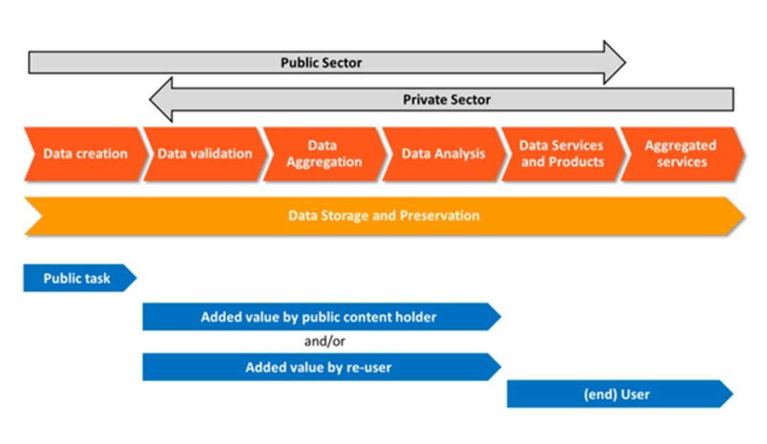 Avoimen datan tapauksessa datan tuottajat ovat usein julkisen sektorin toimijoita. Arvoketjun ensimmäinen vaihe on datan luominen. Tiedot validoidaan ja jaetaan, esimerkiksi avoimen datan portaalin tai yksityisen yrityksen kautta, minkä jälkeen ne voidaan analysoida. Yhdistämällä eri tietojoukot luodaan uutta tietoa, joka voi johtaa uusiin tietopalveluihin tai tuotteisiin. Lopuksi näitä datapalveluita ja tuotteita voidaan edelleen yhdistellä loppukäyttäjän erilaisiin tarpeisiin. Avoimen datan arvoketjussa tarvitaan usein julkisen sektorin lisäksi yksityisen sektorin yrityksiä, jotka pystyvät jalostamaan dataa ja tietoa liiketoiminnaksi. Tämä prosessi esitetään kuvassa 3.