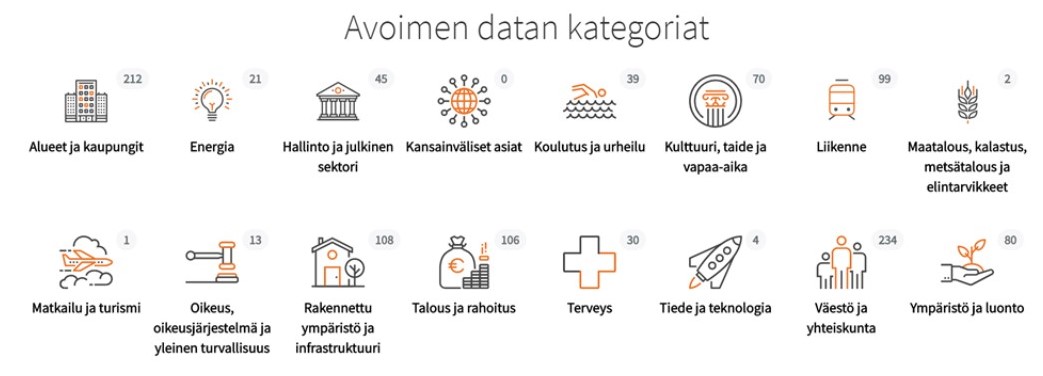 Avoimen datan palveluita on nykyään jo runsaasti saatavilla. Ensimmäisen maininnan ansaitsee Avoindata.fi-palvelu, joka pyrkii rohkeasti siihen, että Suomen kaikki avoin data löytyisi yhdestä paikasta. Joulukuussa 2019 palvelussa oli saatavilla 1700 tietoaineistoa jaoteltuina 16 eri aihekategoriaan, jotka näkyvät kuvassa 1. (Avoindata.fi 2020.)
