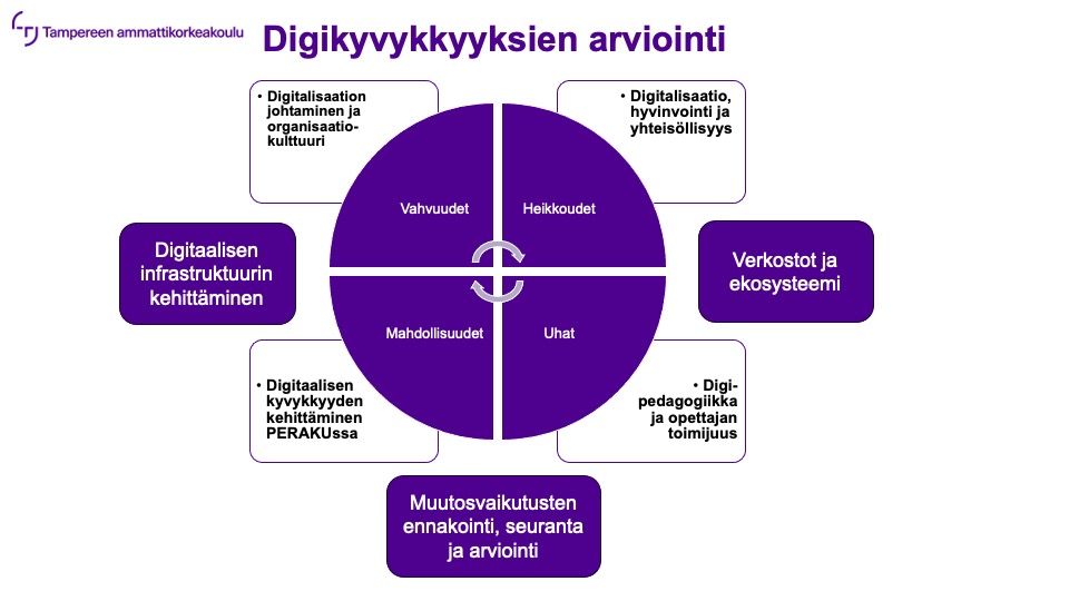 PERAKU-yksikön kehittämispäivässä pidetyssä työpajassa henkilöstö (n = 56) pohti pienryhmissä digikyvykkyyksiin liittyviä vahvuuksia, heikkouksia, mahdollisuuksia ja uhkia seitsemän eri teeman avulla. Nämä teemat olivat Digitaalisen infrastruktuurin kehittäminen, Muutosvaikutusten ennakointi, seuranta ja arviointi, Verkostot ja ekosysteemi, Digitalisaation johtaminen ja organisaatiokulttuuri, Digitalisaatio, hyvinvointi ja yhteisöllisyys, Digipedagogiikka ja opettajan toimijuus sekä Digitaalisen kyvykkyyden kehittäminen. Ryhmät tunnistivat lähes yhtä paljon positiivisia asioita (yhteensä 22 mainittua vahvuutta ja 19 mahdollisuutta) kuin negatiivisia (yhteensä 23 mainittua heikkoutta ja 20 uhkaa). Eniten kommentteja kertyi Digitalisaatio, hyvinvointi ja yhteisöllisyys sekä Digitaalisen kyvykkyyden kehittäminen PERAKUssa -teemojen alle, mikä todennäköisesti heijastelee teemojen koettua tärkeyttä. SWOT-analyysien tulokset on yhdistetty ja tiivistetty alla olevaan kuvaan 2.