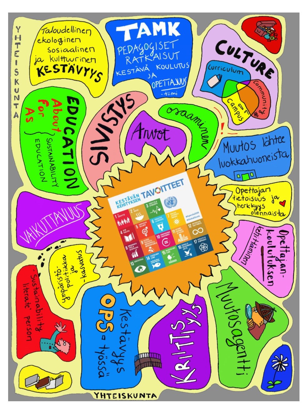 Kuvatessamme kestävän kehityksen opetussuunnitelman rakentamista ja kestävän kehityksen pedagogiikkaa olemme hahmotelleet kokonaisvaltaisesti kestävän koulutuksen ja opettajuuden mallia. Laajasti ajatellen kestävä koulutus kattaa koko oppilaitoksen toiminnan: kumppanuudet, oppilaitoskulttuurin, kampustoiminnot ja opetussuunnitelmatyön sekä opetuksen toteuttamisen. Se on osa strategian toimeenpanoa. Kestävästi toimivalle opettajalle löytyy hyvä kuvaus korkeakoulumme yhteisistä osaamisista.