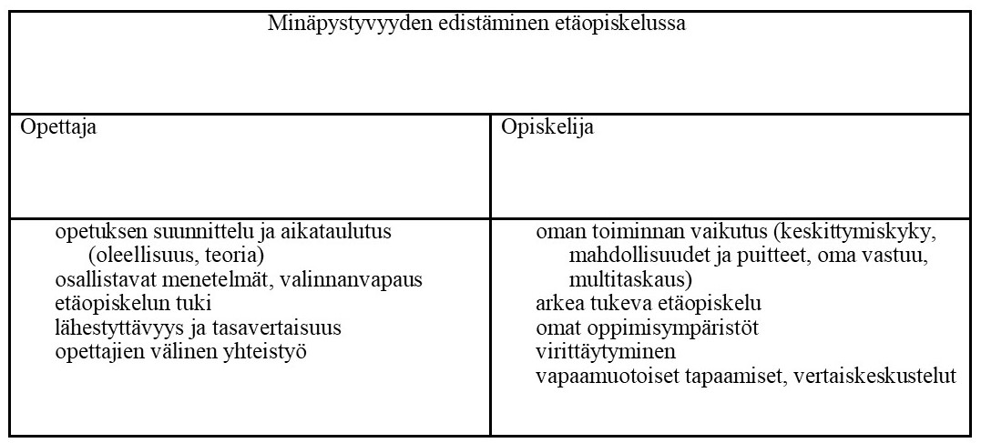 Minäpystyvyysteorian mukaan myönteinen käsitys omasta pystyvyydestä ennustaa työstä motivoitumista (Bandura 1997). Etäopiskeluun siirtymisen tilanne on asettanut minäpystyvyyden koetukselle. Monelle opiskelijalle tämän kaltainen tilanne, että opiskellaan kokonaan verkkoympäristöä käyttäen, on ennalta kokematon. Tämän vuoksi omaa aiempaa käsitystä siitä, miten tilanteesta selviää, ei ole. Bandura (1977) painottaa minäpystyvyyden positiivista kehää: mitä enemmän ihminen luottaa omiin kykyihinsä ja selviytymiseensä, sitä luottavaisempi hän on omaa itseään kohtaan uusissa ja ennalta-arvaamattomissa tilanteissa. Minäpystyvyys rakentuu positiivisen vertaispalautteen ja yhteisöiltä saadun palautteen kautta ja se tarvitsee rakentuakseen positiivisia kokemuksia ja stressitekijöiden vähentämistä jännittävissä ja pelottavissa tilanteissa (Bandura 1977). Etäopiskelutilanteet eivät välttämättä ole pelottavia tilanteita, mutta uudenlaisen tekniikan ja kasvottomissa tilanteissa puhumisen erilaisuus tuo mukanaan jännittävyyttä, samoin kuin vaikkapa nettiyhteyksien toimivuus.
