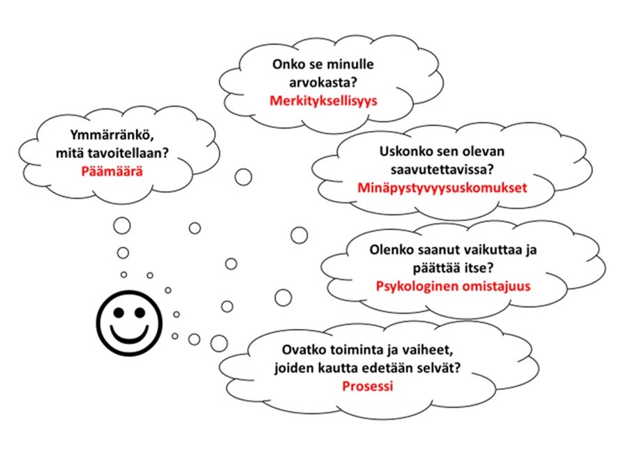 Myös psykologinen omistajuus on koettu ilmiö. Se viittaa siihen, että henkilö tuntee olevansa itse vastuussa jostakin kohteesta ja kokee, että jokin asia on ”hänen” (Pierce, Kostova & Dirks 2001, 5-6). Psykologisen omistajuuden syntyminen edellyttää, että opiskelija saa osallistua toiminnan suunnitteluun ja vaikuttaa omaan opiskeluunsa. Opiskelijan itselleen asettamat tavoitteet ennustavat merkittävällä tavalla oppimisprosessin luonnetta ja tuloksia (Korhonen & Hietava 2011). Kun opiskelija näkee tavoitteiden yhteyden myös opiskelun jälkeiseen aikaan, tunne omistajuudesta vahvistuu.