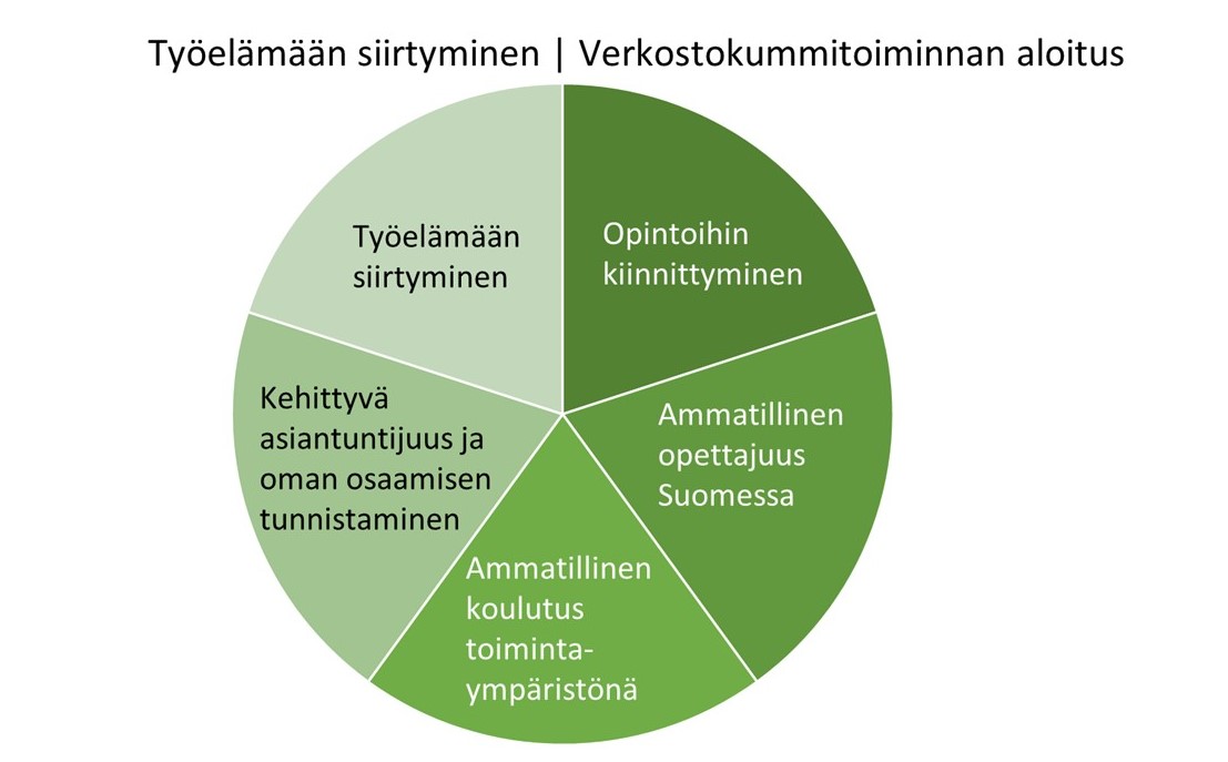 Osallistujien siirtyessä ammatillisesta opettajankoulutuksesta työelämään heille pyritään takaamaan nivelvaiheen tuki. Työelämään siirtymistä ja työllistymistä tuetaan esimerkiksi CV-pajojen ja työelämän edustajien kanssa yhteistyössä toteutettujen rekrytointimessujen avulla. (Nikku 2022.) Jotkut osallistujat siirtyvät vaivattomasti työelämään, koska ovat jo työskennelleet oppilaitoksessa opettajan tehtävässä – joskin kelpoisuutta vailla – ennen opettajankoulutukseen tuloa.