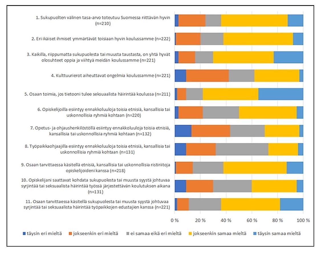 Enemmistö vastaajista koki osaavansa käsitellä erilaisia ristiriitoja. Neljä viidestä koki osaavansa toimia, mikäli oppilaitoksessa ilmenee seksuaalista häirintää, ja kolme viidestä osaavansa käsitellä etnisiä, kansallisia tai uskonnollisia ristiriitoja opiskelijoiden kanssa. Osa vastaajista ilmoitti, ettei osaa käsitellä koulussa vastaantulevia edellä mainittuja tasa-arvoon ja yhdenvertaisuuteen liittyviä ristiriitatilanteita.