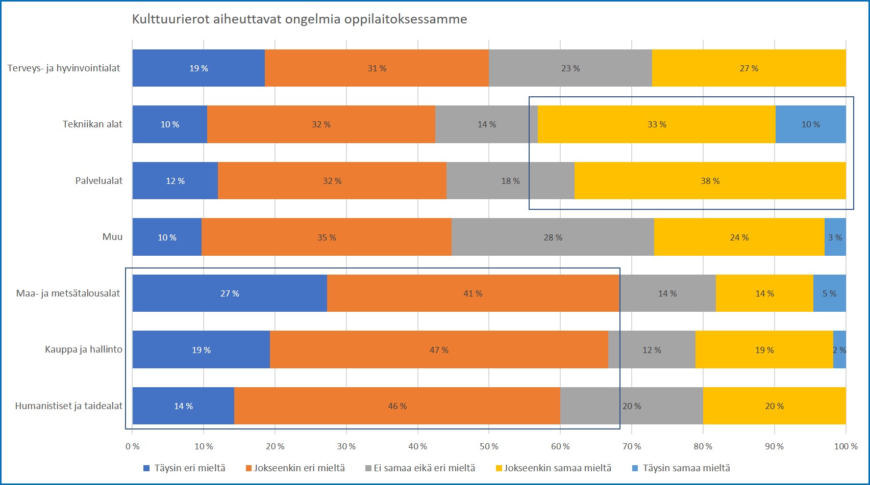 Tutkintoaloittain tarkasteltaessa palvelu- (22 %) sekä maa- ja metsätalousalalla (23 %) muita aloja suurempi osuus vastaajista koki, että eri ikäiset ihmiset eivät ymmärrä toisiaan hyvin heidän oppilaitoksessaan. Humanistisilla ja taidealoilla näin ajattelevien osuus oli selvästi muita aloja pienempi (9 %). Tutkintoalojen näkemykset erosivat jonkin verran myös siinä, aiheuttavatko kulttuurierot ongelmia heidän oppilaitoksissaan. Maa- ja metsätalousalalla (68 %), kaupan ja hallinnon alalla (66 %) sekä humanistisilla ja taidealoilla (58 %) selvästi yli puolet oli tästä eri mieltä, kun taas tekniikan aloilla (43 %) ja palvelualoilla (38 %) merkittävä osa vastaajista oli sitä mieltä, että kulttuurierot aiheuttavat ongelmia. (Kuva 3.)