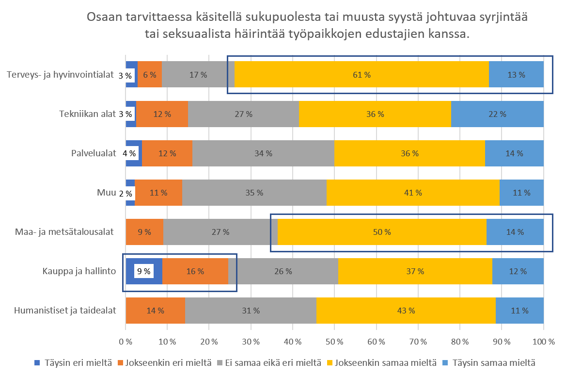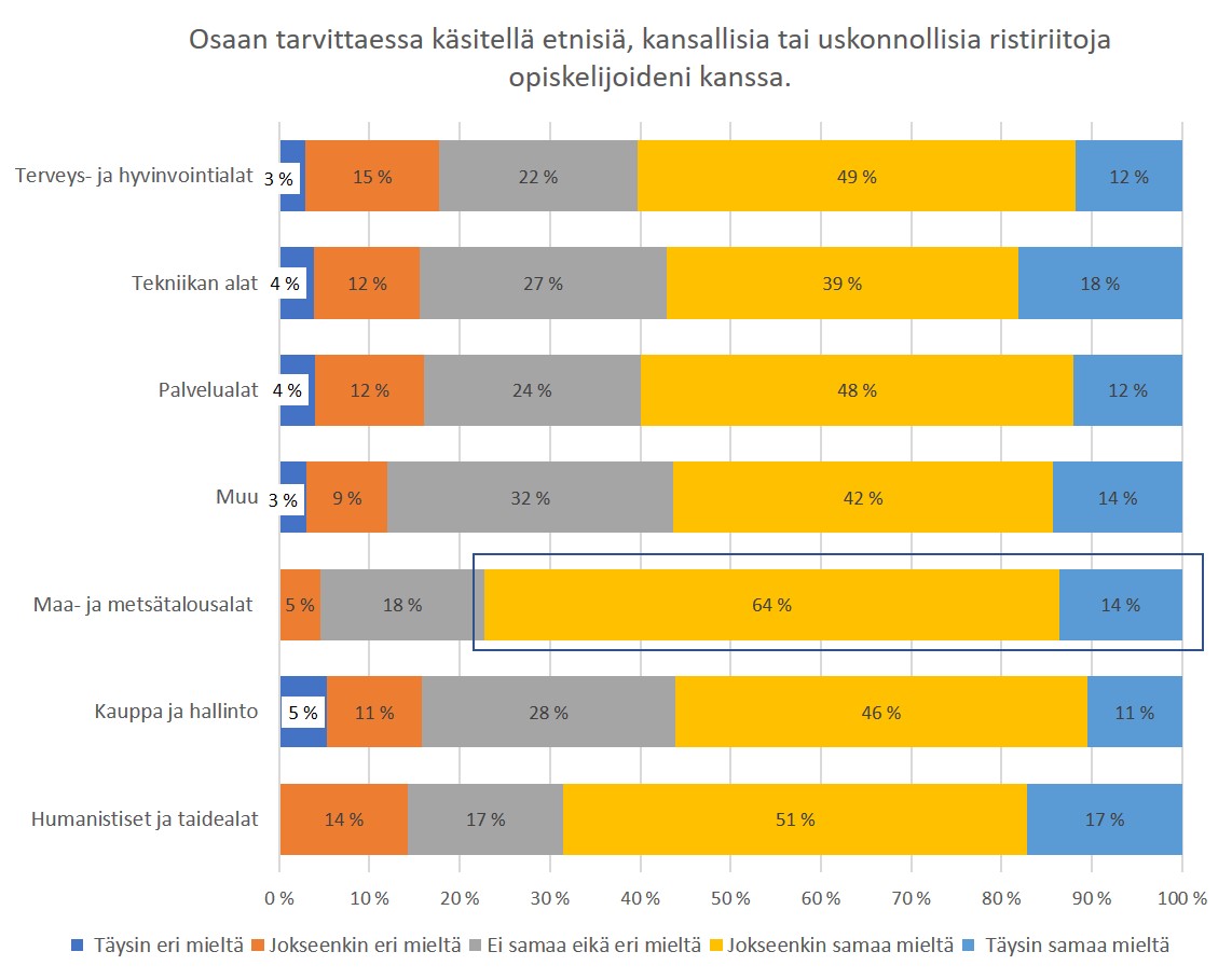 Maa- ja metsätalousalan henkilöstöstä muita aloja suurempi osuus (80 %) koki osaavansa tarvittaessa käsitellä etnisiä, kansallisia tai uskonnollisia ristiriitoja opiskelijoiden kanssa. Terveys- ja hyvinvointialalla (74 %) sekä maa- ja metsätalousalalla (64 %) muita aloja suurempi enemmistö vastaajista koki myös osaavansa tarvittaessa käsitellä sukupuolesta tai muusta syystä johtuvaa syrjintää tai seksuaalista häirintää työpaikkojen edustajien kanssa. Kaupan ja hallinnon alalla oli puolestaan muita aloja jonkin verran enemmän (25 %) niitä, jotka eivät kokeneet osaavansa käsitellä näitä asioita työpaikkojen edustajien kanssa. (Kuvat 5 ja 6.)