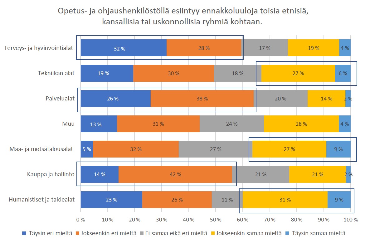Terveys- ja hyvinvointialalla (60 %), palvelualoilla (64 %) sekä kaupan ja hallinnon alalla (58 %) enemmistö vastaajista arvioi, että opettajien keskuudessa ei esiinny ennakkoluuloja muita etnisiä, kansallisia tai uskonnollisia ryhmiä kohtaan. Tekniikan alalla (33 %), ryhmässä muut (32 %), maa- ja metsätalousalalla (36 %) sekä humanistisilla ja taidealoilla (40 %) oli puolestaan muita aloja enemmän niitä, jotka arvelivat, että tällaisia ennakkoluuloja esiintyy. (Kuva 8.)