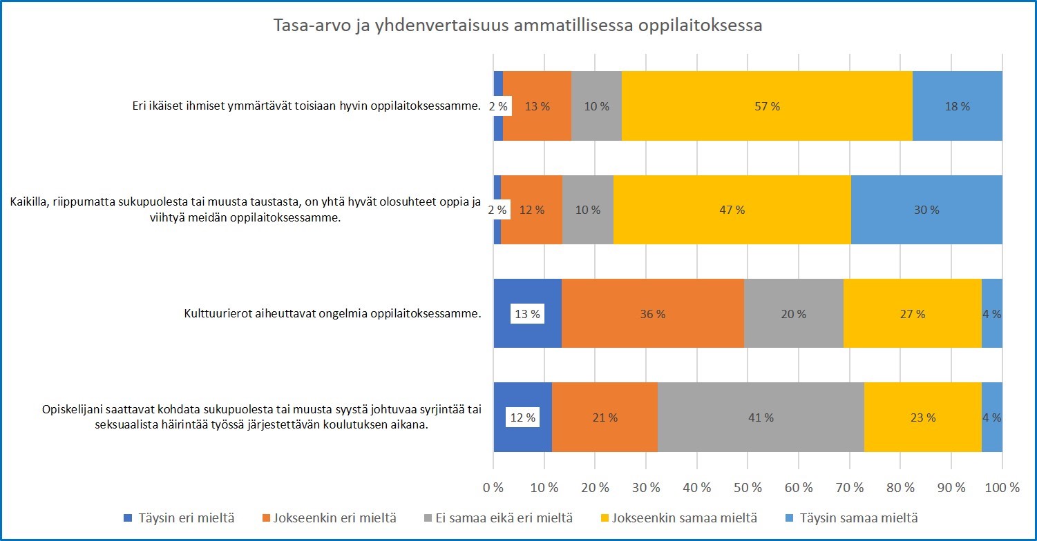 Kyselyyn vastanneiden mielestä eri-ikäiset ihmiset ymmärtävät toisiaan hyvin ja kaikilla riippumatta sukupuolesta tai muusta taustasta on yhtä hyvät olosuhteet oppia ja viihtyä heidän oppilaitoksessaan. Yli kolmanneksen mielestä kulttuurierot kuitenkin aiheuttavat ongelmia oppilaitoksessa. Lähes kolmannes myös arvioi, että heidän opiskelijansa saattavat kohdata sukupuolesta tai muusta syystä johtuvaa syrjintää tai seksuaalista häirintää koulutuksen aikana. (Kuva 2.)