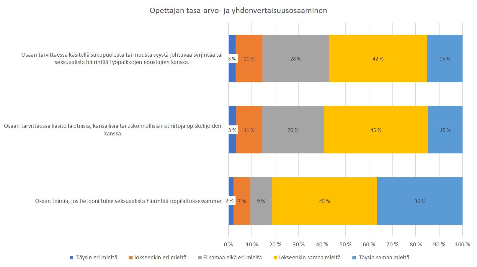 Selkeä enemmistö vastaajista koki osaavansa toimia, jos saa tiedon seksuaalisesta häirinnästä oppilaitoksessa. Noin puolet kyselyyn vastanneista koki myös osaavansa tarvittaessa käsitellä etnisiä, kansallisia tai uskonnollisia ristiriitoja opiskelijoidensa kanssa ja sukupuolesta tai muusta syystä johtuvaa syrjintää tai seksuaalista häirintää työpaikkojen edustajien kanssa. (Kuva 4.)