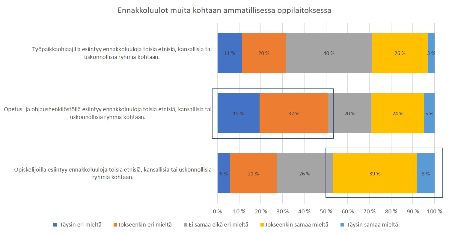 Kyselyyn vastanneista noin puolet (51 %) arveli, että opettajien keskuudessa ei esiinny ennakkoluuloja toisia etnisiä, kansallisia tai uskonnollisia ryhmiä kohtaan. Suunnilleen yhtä suuri osuus (47 %) kuitenkin arveli, että opiskelijoiden keskuudessa ennakkoluuloja toisia etnisiä, kansallisia tai uskonnollisia ryhmiä kohtaan esiintyy. Työpaikkaohjaajien keskuudessa esiintyvien ennakkoluulojen osalta suuri osa vastaajista (40 %) ei ollut samaa eikä eri mieltä väittämästä. (Kuva 7.)