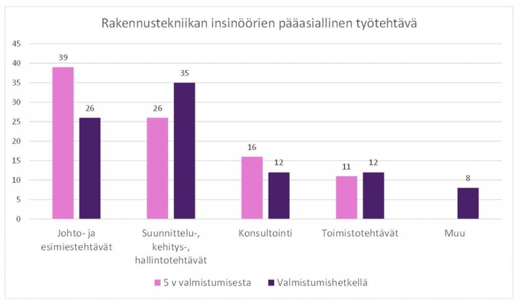 Tarkasteltaessa työtehtäviä vähän pidemmällä aikasarjalla on huomattava, että etenkin tradenomeilla eri vuosina valmistuneiden tehtävien painotukset viisi vuotta valmistumisen jälkeen voivat olla hyvinkin erilaisia. Viimeisin kyselyvuosi näyttäytyy erityisen poikkeavana. Sekä suunnittelu-, kehitys- ja hallintotehtäviä että markkinointi- ja myyntitehtäviä tekevien vastaajien osuus oli vuonna 2021 melkein 10 prosenttiyksikköä suurempi kuin aiempina vuosina. Johto- ja esihenkilötehtävissä, mutta myös toimisto- ja asiakaspalvelutehtävissä taas oli viimeisimmän vuoden vastaajista pienempi osuus kuin aiempien vuosien vastaajista. Rakennustekniikan insinööreillä vuosittaista vaihtelua tehtävien laadussa oli kaikkiaan vähemmän, mutta siinä ryhmässä johto- ja esihenkilötehtävien osuus näyttäisi kasvaneen tasaisesti neljän vuoden ajan. Vuonna 2018 kyselyyn vastanneista (2013 valmistuneet) 24 % työskenteli näissä tehtävissä, vuonna 2021 (2016 valmistuneet) jo 38 %. (Opetushallinnon tilastopalvelu Vipunen n.d.)