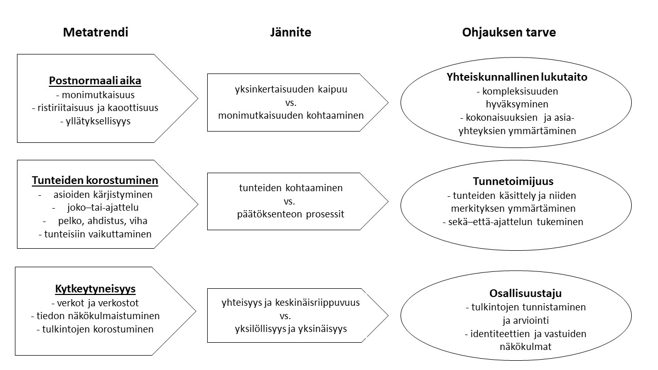 Postnormaali aika, tunteiden korostuminen ja kytkeytyneisyyden lisääntyminen saavat aikaan jännitteitä, jotka lisäävät ohjauksen tarvetta. Kuvaan 1 on tiivistetty edellä kuvatut metatrendien vaikutukset ohjauksen tarpeisiin.
