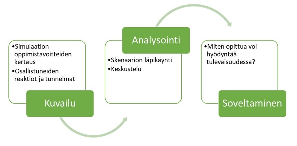 Simulaatio on terveysalalla suosittu oppimismenetelmä, joka mahdollistaa teknisten ja ei-teknisten taitojen harjoittelun turvallisessa ympäristössä (Lynch 2020). Simulaatio-opetuksessa hyödynnetään Kolbin (1984) ajattelua kokemuksellisen oppimisen kehästä, jossa oppiminen tapahtuu sykleissä: uusi tieto rakentuu vanhan tiedon päälle. Dieckmannia (2009) mukaillen simulaation rakenteeseen kuuluu simulaatioon valmistautuminen (mm. skenaarion alkuinfo, simulaattoriin tutustuminen), skenaario ja oppimiskeskustelu.
