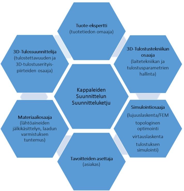 Kuva 1 3D-tulostettujen kappaleiden suunnittelu on koko suunnitteluketjun osaamisten summa (Raukola 2018, muokattu).