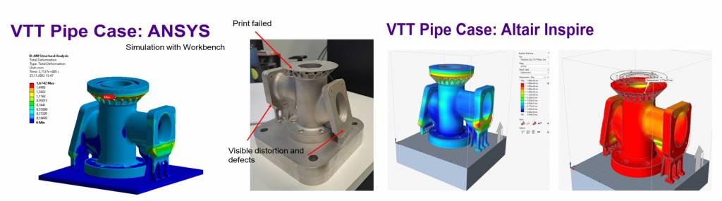 Kuva 2 Metallin 3D-tulostuksen simulointi ANSYS ja Altair Inspire -ohjelmistoilla ja simuloinnin validointi SLM 125 HL ‑tulostimella (Ukonaho 2022).
