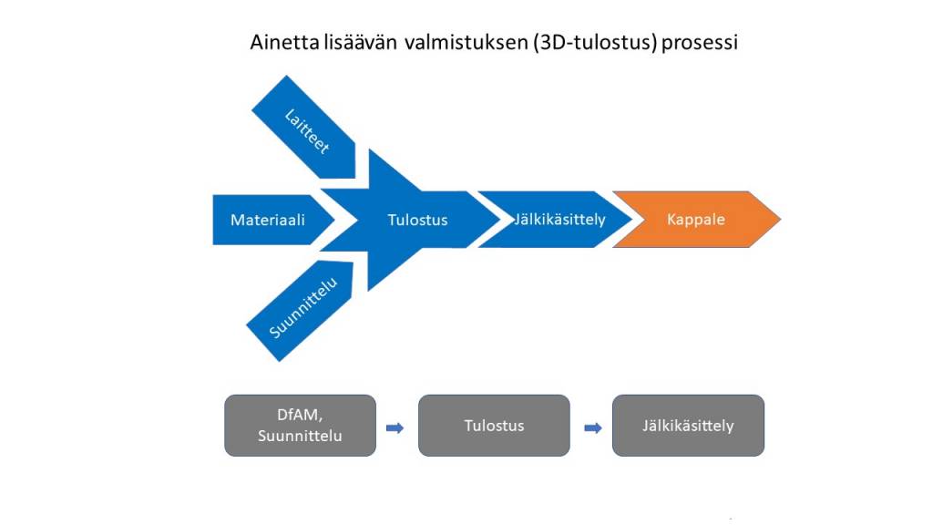 Suunnitteluvaiheen tuloksena saadaan määriteltyä kappaleen materiaali. Seuraavassa vaiheessa valitaan soveltuva 3D-tulostustekniikka ja -laitteisto, minkä jälkeen simuloidaan tulostusprosessi jälkikäsittelyineen. Viimeisenä vaiheena toteutetaan mahdollisesti simuloinnissa ilmenneet kappaleen rakenteen muutostarpeet.