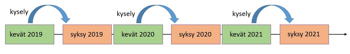 Kuvassa 2 havainnollistetaan seurantakyselyn jaksottamista. Tarkoituksena on kerätä vuosittain opiskelijoiden matemaattisten opintojen suorittamiskokemuksia ja analysoida niitä. Saatuja tuloksia on tarkoitus hyödyntää seuraavan lukuvuoden opetuksen suunnittelussa.