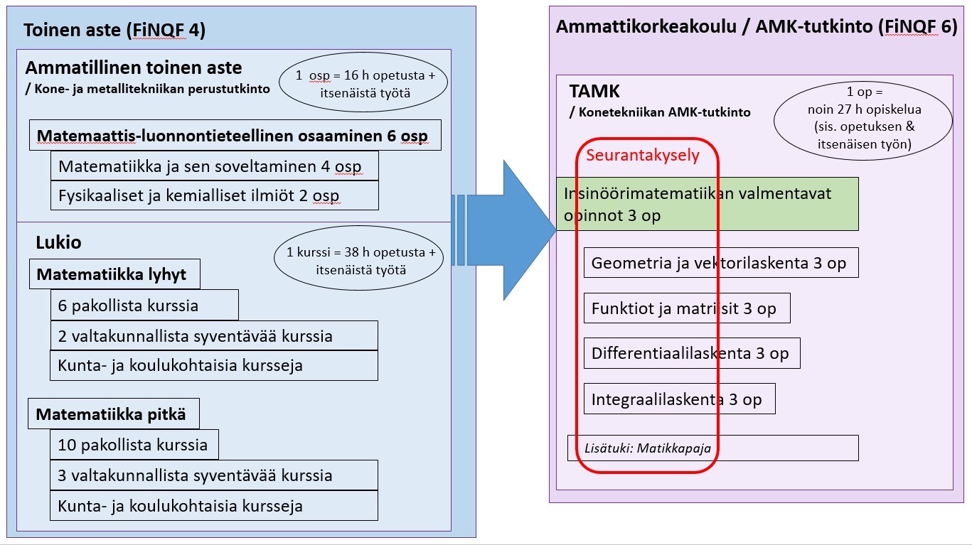 Ammatillinen perustutkinto ja ylioppilastutkinto antavat hakukelpoisuuden AMK-tutkintoon (TUNI 2019). Nämä opinnot ovat Suomen tutkintojen viitekehyksessä (FiNQF) tasolla 4, kun ammattikorkeakoulun AMK-tutkinto on FiNQF-tasolla 6 (OPH 2019c). Vaikka molemmat hakukelpoisuuden antavat toisen asteen tutkinnot ovat samalla FiNQF-tasolla, lukion matematiikan opinnot ovat laajemmat kuin ammatillisten perustutkintojen vastaavat opinnot. Vuonna 2004 tehdyn tutkimuksen perusteella todettiin, että lähtötasotesteissä insinööriopintoja aloittavien opiskelijoiden matemaattisissa valmiuksissa oli eroja. Ammatillisen tutkinnon suorittaneilla matematiikan osaamisen taso oli heikompi kuin lukiossa lyhyen matematiikan suorittaneilla ylioppilailla. (Tuohi, Helenius & Hyvönen 2004, 94, 106.) Konetekniikassa heikot matemaattiset taidot ja kiinnostuksen puute perusaineisiin kuten statiikkaan, dynamiikkaan ja lujuusoppiin voivat aiheuttaa kasaantuvia ongelmia myös muihin ammattiaineisiin. Opintoja pitäisi muuttaa entistä motivoivimmiksi. (Ahonen 2005.)