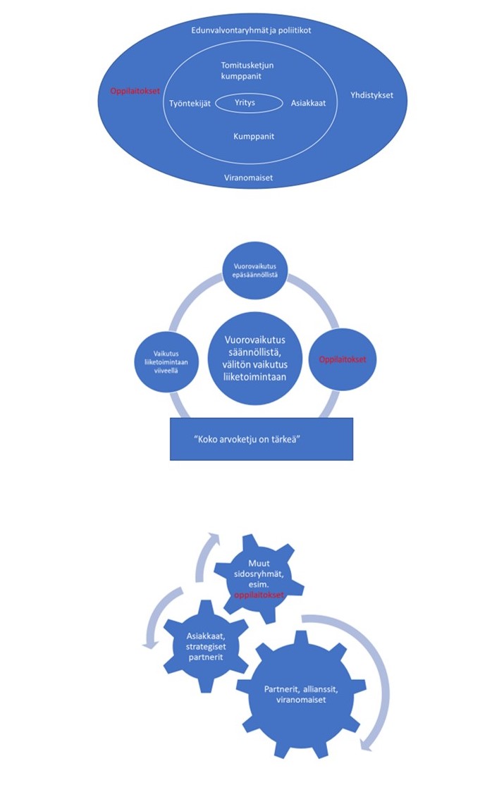 Tutkimus tunnisti kolme erilaista sidosryhmäkarttaa (Kuva 2), joissa kaikissa oppilaitokset sijoittuivat ulkokehälle ja asiakkaat ja tärkeimmät kumppanit sisäkehälle. Sidosryhmäajattelu on muuttunut merkittävästi viimeisten vuosikymmenien aikana. Sen sijaan että keskityttäisiin yksittäisiin sidosryhmiin ja siihen, mikä niistä on tärkeä ja mikä vähemmän tärkeä yritykselle tai organisaatiolle (esim. Freeman 1984, Mitchell ym. 1995), sidosryhmäsuhteiden johtamisessa on siirretty arvon luomiseen (esim. Kujala ym. 2019). Yritysjohtajien sidosryhmäpuhe osoitti, että sen sijaan, että vain myytäisiin tuotteita tai palveluita asiakkaille, heitä ajatellaan ja kohdellaan kumppaneina. Kujala ym. (2019) esittämän SVC-mallin (Stakeholder Value Creation) kaikkia kolmea ominaisuutta, yhteistyökykyä, yhteisen edun tavoittelua ja luottamusta, tarvitaan toimivassa suhteessa sekä sidosryhmäkartan sisä- että ulkokehällä.
