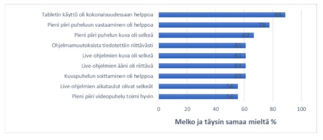 Omaishoitajat (n=19) kokivat tabletin käytön ja puheluun vastaamisen helpoksi, eniten kehittämisen tarvetta koettiin olevan videopuhelun toimivuudessa. Noin 60% vastaajista arvioi live-lähetysten aikataulut selkeäksi, lähetysten kuvan selkeäksi ja äänen laadun riittäväksi. Myös kuvapuhelun soittamisen koki helpoksi noin 60 % vastaajista (kuva 1). Live-ohjelmien toteutuksessa ilmeni ajoittain ongelmia nettiyhteyden katkeamisten vuoksi, mikä aiheutti harmia. Live-lähetys ei toteutunut muutamana kertana laisinkaan, mutta näissä tilanteissa osallistujille tarjottiin ylimääräinen ohjelma muuna ajankohtana.