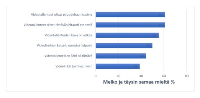 Opiskelijoiden tuottamia tietoiskutyyppisiä videotallenteita omaishoitajat saattoivat katsoa itselle sopivana ajankohtana, mikä koettiin hyväksi. Omaishoitajista noin 60% arvioi videotallenteiden pituuden sopivaksi ja etenemisen riittävän hitaaksi. Kuvan selkeydessä ja äänessä todettiin kuitenkin olevan vielä kehittämistä, sillä ajoittain ääni ei kuulunut riittävästi. Videolinkit eivät aina toimineet, mutta katselu onnistui kuitenkin hyvin sen jälkeen, kun linkki oli saatu auki (kuva 2). 56% omaishoitajista katsoi videotallenteita. Omaishoitajat toivoivat joihinkin videoihin hitaampaa ja rauhallisempaa esitystapaa sekä riittävää ääntä ja selkeämpää sanojen artikulointia.
