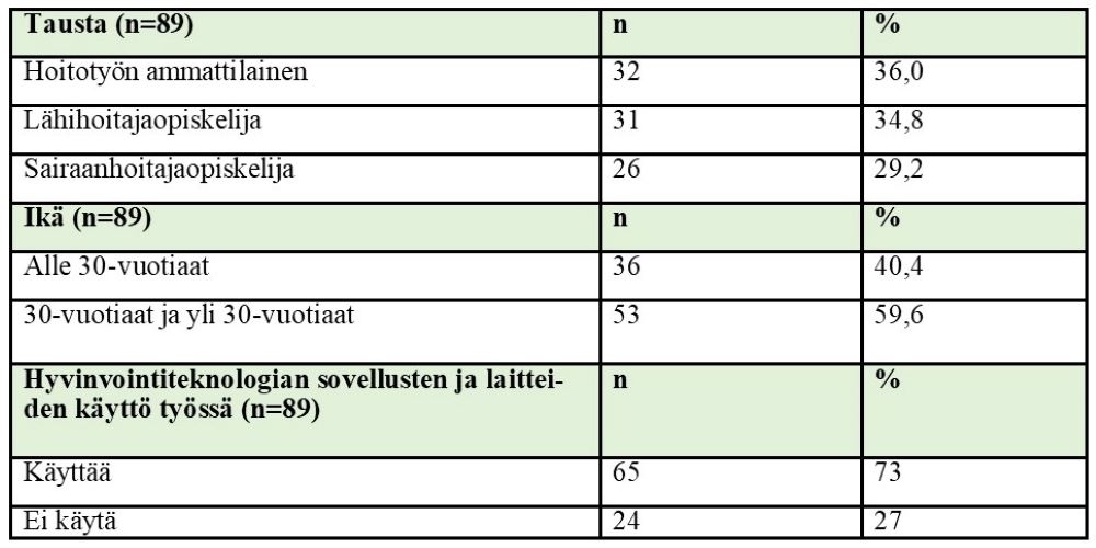 Kyselyyn vastasi yhteensä 89 vastaajaa. Ryhmä koostui hoitotyön ammattilaisista (36 %), lähihoitajaopiskelijoista (35 %) ja sairaanhoitajaopiskelijoista (29 %). Vastaajista yli puolet (60 %) oli iältään 30-vuotiaita tai vanhempia ja vajaa puolet (40 %) vastaajista oli iältään alle 30-vuotiaita. Hoitotyön ammattilaisista ja hoitotyön opiskelijoista suurin osa (73 %) oli käyttänyt työssään erilaisia hyvinvointiteknologian sovelluksia ja laitteita, kun taas vastaajista reilu neljäsosa (27 %) ei ollut käyttänyt työssään hyvinvointiteknologian sovelluksia ja laitteita.