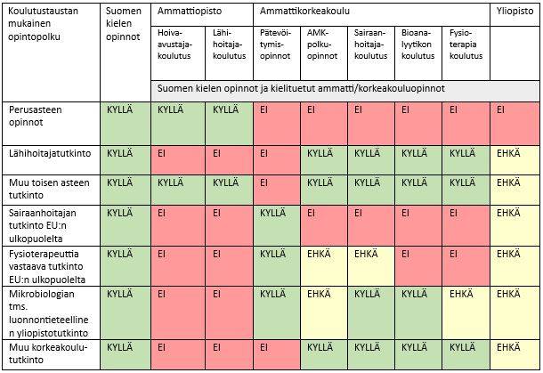 Käytännön ohjaustyökaluksi tuotimme matriisin, joka perustuu maahanmuuttaneen aiemman koulutustaustan huomioon ottamiseen ja suomalaisen koulutusjärjestelmän sote-alan opiskelumahdollisuuksiin (Kuva 1). Matriisilla pyritään ohjaamaan henkilö vähintään sille koulutustasolle, josta hänellä on aiempi tutkinto.
