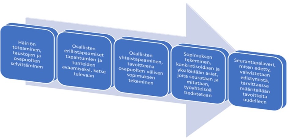 Järvisen ja Luhtaniemen (2013, 1348) restoratiivisessa sovitteluprosessissa kiinnitetään huomiota osapuolten aktiivisuuteen ja tärkeyteen konfliktin ratkaisussa. Prosessissa käydään kunnioittavaa vuoropuhelua ja tunteiden käsittelyä, jossa tavoitteena on ongelmien korjaaminen ja molempien osapuolten voittaminen eli win-win -ratkaisu. Sovitteluprosessissa on kolme vaihetta, joista ensimmäisenä on osallisten erillistapaamiset tapahtumien ja tunteiden avaamiseksi sekä katseen suuntaamiseksi tulevaisuuteen. Näiden jälkeen toteutetaan yhteistapaaminen, jossa on tavoitteena osapuolten välisen sopimuksen tekeminen. Tässäkin tapaamisessa käsitellään osapuolten tarinat ja tunteet sekä yhteiset tavoitteet. Lopuksi solmitaan osapuolten kesken sopimus, missä konkretisoidaan ja yksilöidään asiat, joita seurataan ja mitataan sovitun ajanjakson aikana. Asiasta myös tiedotetaan työyhteisössä.