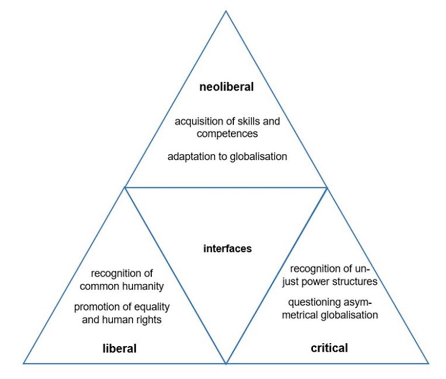 On the basis of Pashby et al.’s (2020) three key discursive orientations of GC, TES’ perceptions are found to be heterogeneous and linked to the neoliberal, liberal as well as critical theory of GC. On the one hand, TES associate GC with universal values that are built around the global public good and the idea of a common humanity (liberal GC). Here their perceptions of GC refer to equality and human rights and are therefore in accordance with UNESCO’s (2018) viewpoint on the basic principles of GC. On the other hand, the majority of them believe that GC is also about the acquisition of certain skills such as foreign language and intercultural skills in order to keep pace with globalisation (neoliberal GC). Hence, global economic and technological processes are perceived as a shaping force one needs to adapt to by filling gaps of skills. At the same time, TES perceive worldwide interconnections between humans as unjust due to asymmetrical globalisation which provides prosperity to a few and poverty to many (critical GC). In this context, Western supremacy and unequal distribution of power and resources worldwide are among the issues raised by TES. Figure 1 illustrates the three different orientations to GC with a space of ambivalence as interfaces at the centre.