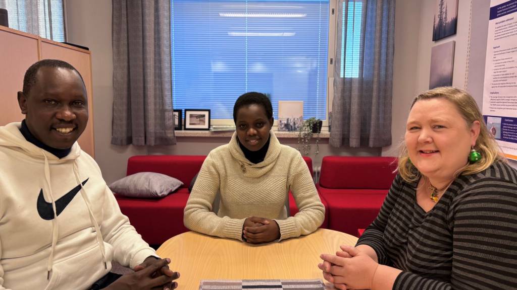 Photo 1 Kenyan teacher trainees Faith Chemutai and Josephat Kiplimo Tum in conversation with Tampere University of Applied Sciences International Planning Officer Krista Merikoski (Photo: Ilkka Piiroinen)