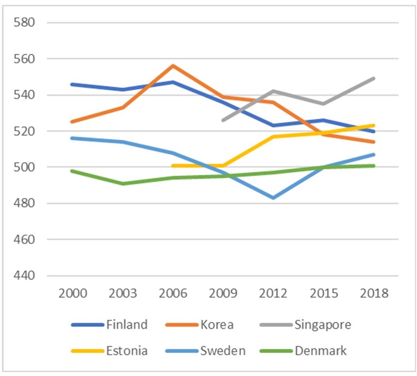 In 2006, Finland’s PISA reading scores peaked at 547 points. Since then, scores have steadily declined, reaching 520 points in 2018. Korea’s score trend is somewhat like Finland’s, but the difference between the starting and peak levels is more pronounced. Finland’s neighboring countries Denmark, Sweden and Estonia have been below Finland in literacy measures in the 2000s, but in recent measures their performance has been positive, with Estonia surpassing Finland’s score in 2018. In the most recently published measures, Singapore was by far the best performer (Koulutuksen tutkimuslaitos, n.d.).